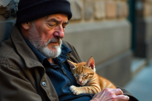 Er hatte weder ein eigenes Zuhause noch eine Familie, aber eine treue Gefährtin fand er: eine kleine Katze, die jede Nacht auf seiner Brust schlief.