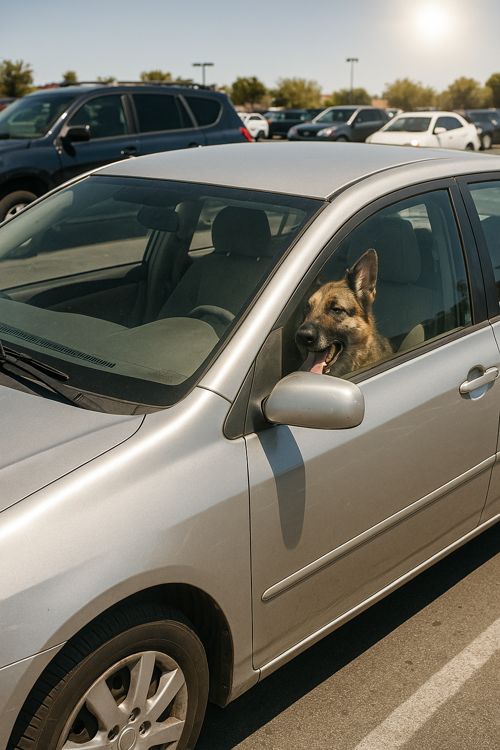 Mein Blick richtete sich auf einen geparkten, silbernen Wagen, nur wenige Plätze entfernt. Im Inneren saß ein Hund – ein Deutscher Schäferhund.