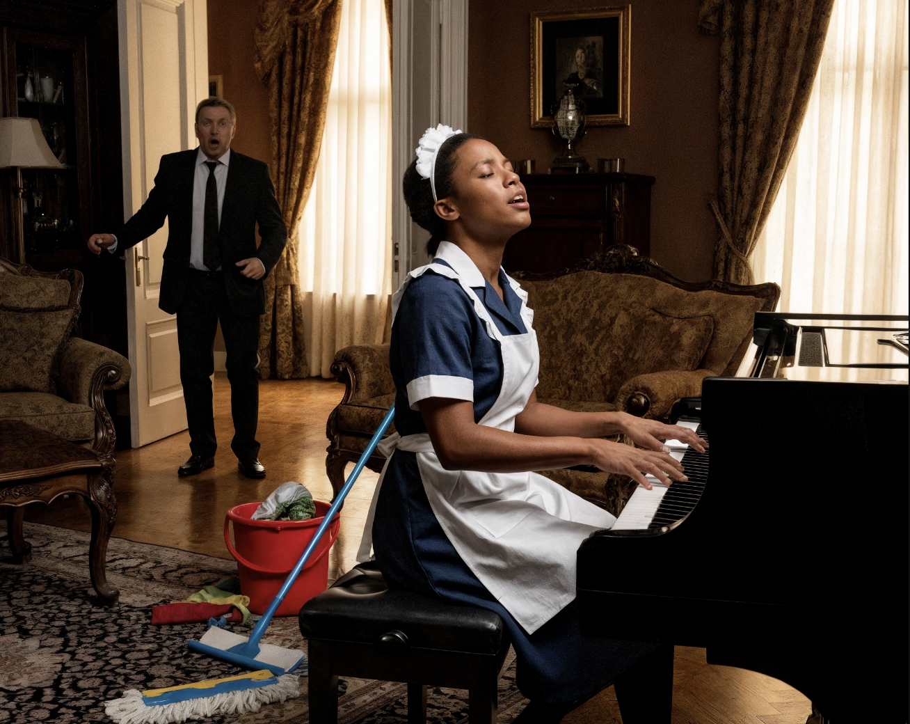 Im Putzdienst-Outfit, Schürze um die Taille gebunden, mit Seifeimer und Mop beiseitegestellt, saß seine Reinigungskraft am Klavier. Mit geschlossenen Augen spielte sie mit anmutiger Souveränität, während ihre Finger über die Tasten glitten. Der Raum füllte sich mit einer leidenschaftlichen Melodie voller Sehnsucht, die nahezu lebendig wirkte.