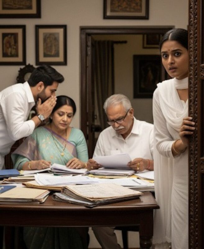 Beim gemeinsamen Essen waren meine Schwiegereltern sichtlich überrascht, weil ich kein Essen servierte. Stattdessen legte ich entschlossen einen Stapel roter Unterlagen vor sie hin. Es handelte sich um den Übertragungsvertrag eines Grundstücks in den Vororten von Noida, das mir meine Eltern als Mitgift überlassen hatten.