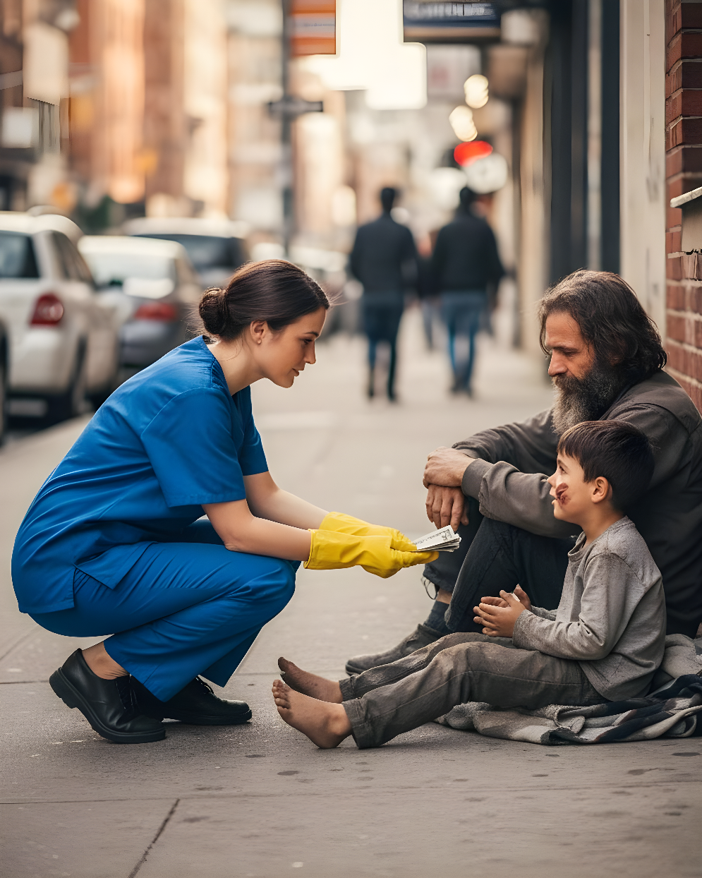 “Nein, mein Sohn, die meisten sind nur in Eile, doch wir werden jemanden Besonderen finden.” Nach einer weiteren Stunde nähern sich die meisten Menschen nicht, einige werfen Münzen achtlos, andere ignorieren sie vollständig. Mateo wird traurig, bis sich eine junge Frau in einem blauen Putzkleid und abgenutzten Turnschuhen vor ihnen niederkniet. Ihre müden Gesichtszüge werden von sanften Augen erhellt.
