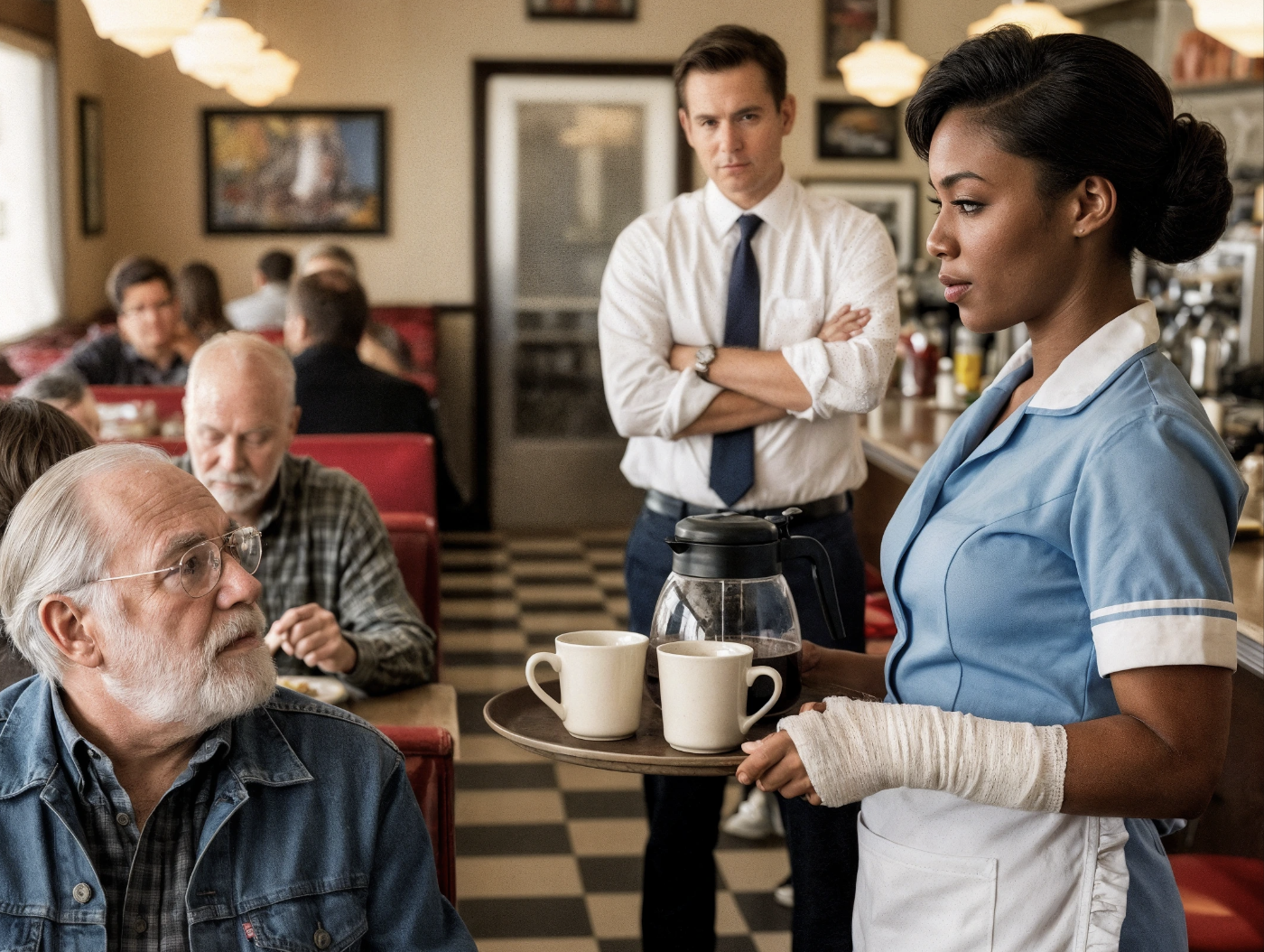 Diese sanfte Stimme gehörte Naomi Carter, einer jungen Kellnerin in hellblauem Outfit. In ihrer rechten Hand hielt sie ein Tablett, während ihre linke Hand frisch verbunden war. Obwohl sie spürbare Schmerzen hatte, zwang sie sich zu einem höflichen Lächeln, während sie behutsam Kaffee einschenkte. Der Gastraum war erfüllt vom Gesprächslärm und dem Klirren des Bestecks, doch ihre Bewegungen wirkten deutlich langsamer als die ihrer Kolleginnen.