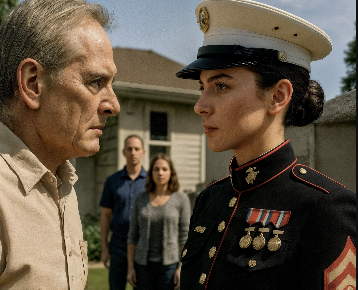 Drinnen blinkten die Lichter des Baumes in einem gleichmäßigen Rhythmus. Mein Leben versammelte sich in einem Raum — Walt mit einer Keksdose, ein Freund gewordenes Seelsorger, Kadetten mit Rationen, Nachbarn, die wissen, wie kleine Gesten ein Netz weben. Mein Vater sprach mit einer Stimme, die ich noch nie gehört hatte — unbeholfen, geprägt von Mühe. „Ich war grausam,“ sagte er. „Ich dachte, ich würde etwas beschützen. Ich habe mich geirrt.“ Der Seelsorger nannte es „eine neue Art des Kniefalls“. Es war nicht die Absolution. Es war ein Anfang.