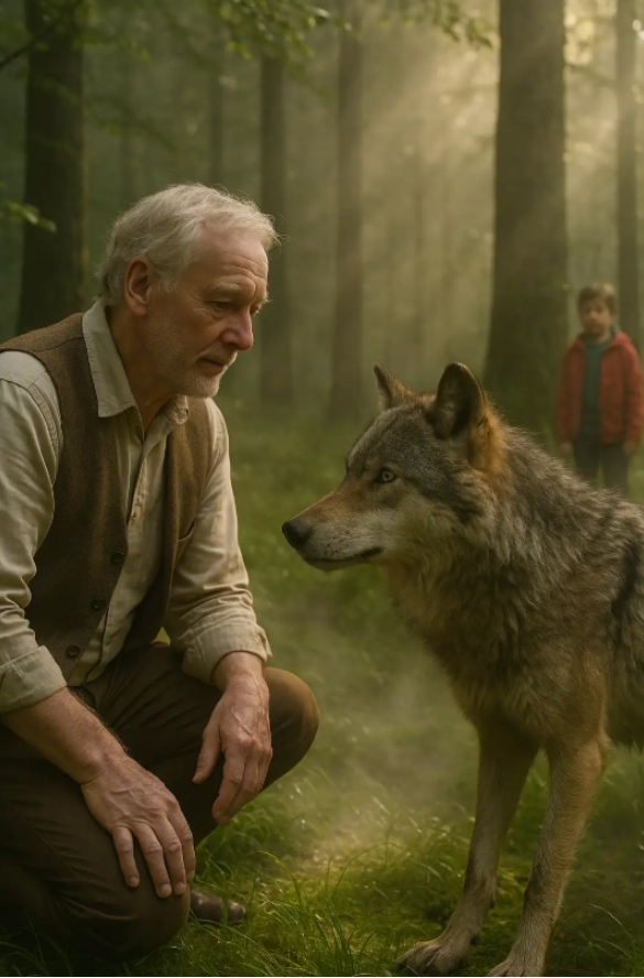 Sascha saß unter einer Tanne, voller Kratzer und Tränen – aber lebte. Als der alte Mann ankam, war der Wolf schon verschwunden.