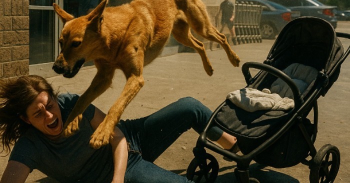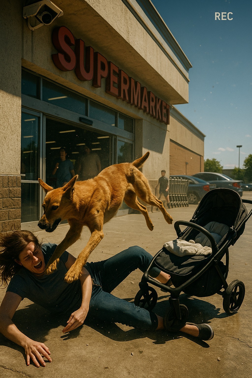 Eine Frau kam mit ihrem kleinen Kind aus dem Geschäft, während sie einen Kinderwagen schob. Sie lächelte, schaute auf ihr Telefon und ging in Richtung Auto. Am Straßenrand wanderte ein älterer Hund mit rotem, kurzem Fell und einem alten Halsband umher. Er wirkte nicht aggressiv, sondern streifte einfach durch die Menge, bis er plötzlich stoppte.