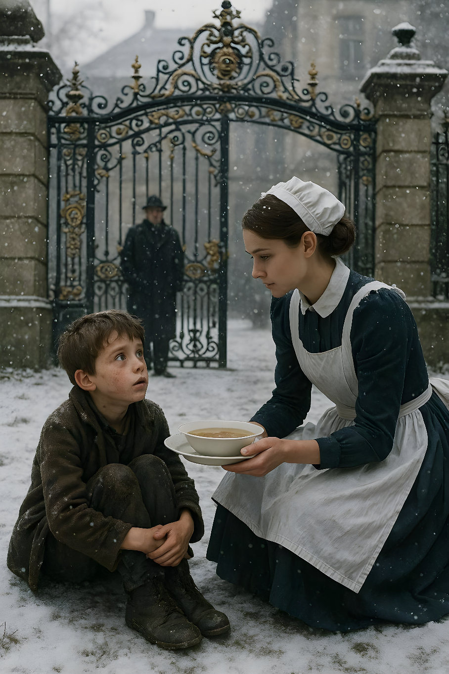 Das Kind schwieg. Seine lädierten Lippen, geprägt vom Frost, blieben geschlossen, als ob das Sprechen ein viel zu großer Luxus für jemanden wäre, der seit Tagen nichts hatte. Claire betrachtete es für einen Moment, ihr Herz überlief mit einer Empathie, von der sie nicht wusste, dass sie sie besaß. Sie schaute sich um und bemerkte, dass der Hausherr, William Harrington, geschäftlich abwesend war, und der Hausdiener nicht da war. Niemand würde sie sehen, niemand würde sie stören.
