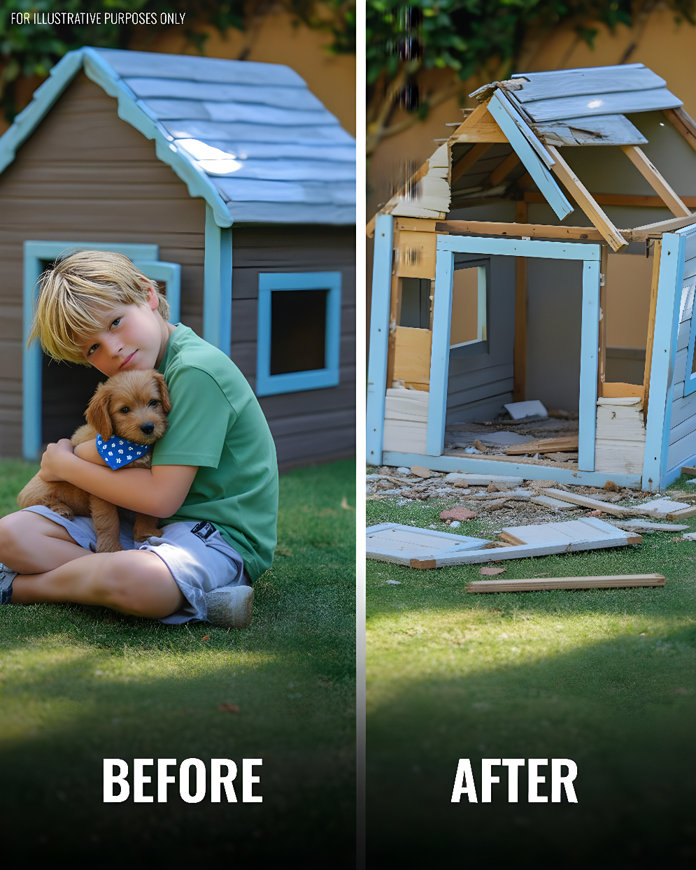 Ein paar Tage später fand Mason das kleine Hundehaus zerstört im Garten. Das Dach eingetreten, Bretter zersplittert, die Decke voller Schlamm. Und Buddy? Verschwunden.