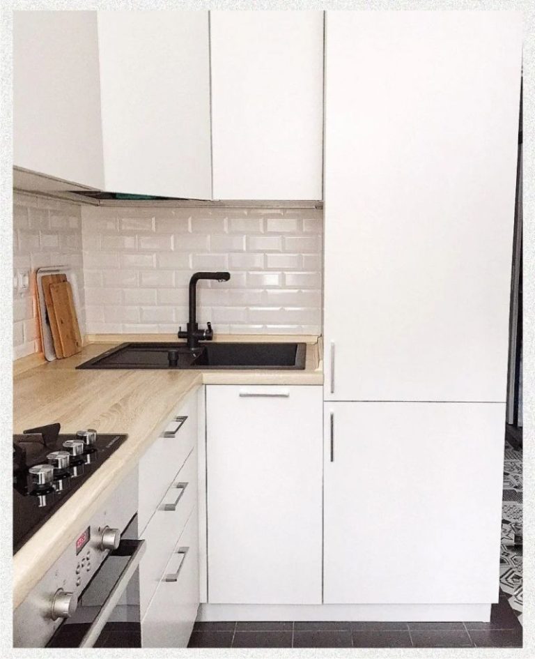 Für die Rückwand entschieden wir uns für klassische weiße Ziegelfliesen, die dem Raum eine zeitlose und elegante Note verleihen. Die Küchenmöbel hielten wir bewusst schlicht mit weißen Schränken und einer Arbeitsplatte aus hellem Holz, die Wärme und Modernität auf harmonische Weise verbindet. Jeder Aspekt der Küche wurde gezielt durchdacht, um den Stauraum optimal zu nutzen und die Funktionalität zu steigern. Die Arbeitsplatte wurde so konzipiert, dass sie sich über die Fensterbank erstreckt und zusätzlichen Platz bietet, ohne den Raum zu überladen.