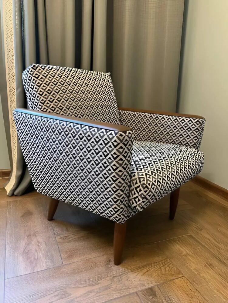 Meine Mutter entschied sich für einen modernen Stoff mit geometrischem Muster. Die Verarbeitung erwies sich als herausfordernd, insbesondere an den Armlehnen, aber mit Geduld und Präzision gelang es mir, den Stoff perfekt anzupassen.