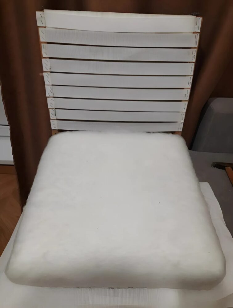 Währenddessen widmeten wir uns der Sitzfläche. Dafür besorgten wir strapazierfähiges Möbelband und verwendeten insgesamt sechzehn Meter davon, um eine stabile Grundlage für die neue Polsterung zu schaffen. Anschließend wurde frischer Schaumstoff zugeschnitten, wobei die Maße leicht angepasst werden mussten, um die neue Sitzhöhe auszugleichen.