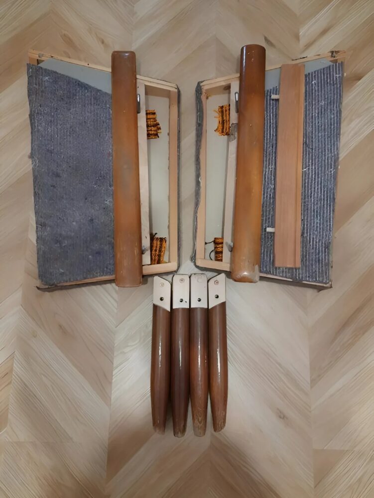 Die alte Polsterung war nicht mehr zu retten, ebenso wenig wie die ausgeleierten Gurte. Also entfernten wir alles und dokumentierten den Aufbau mit Fotos, um später eine exakte Rekonstruktion vornehmen zu können. Das Holzgestell war glücklicherweise in gutem Zustand, nur eines der Beine brauchte eine Verstärkung. Nachdem wir es stabilisiert hatten, ließen wir den Klebstoff für einen Tag aushärten, um eine dauerhafte Haltbarkeit zu gewährleisten.