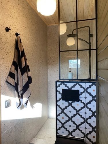 Trotz seiner geringen Größe bietet das Häuschen alles, was man für den Alltag benötigt. Eine stilvoll eingerichtete Nasszelle mit Dusche und WC, eine gut durchdachte Kochnische mit Elektroheizung und liebevoll restaurierte Vintage-Leuchten, die aus einem abgerissenen Altbau stammen, verleihen ihm einen einzigartigen Charme.