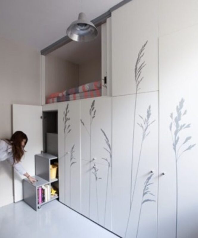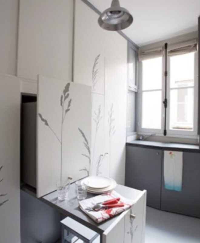 Um die Fläche optimal zu nutzen, entschieden sich die Designer für helle Farbnuancen und durchdachte Möbelstücke, die sowohl funktional als auch optisch ansprechend sind.