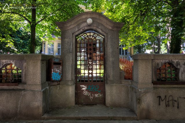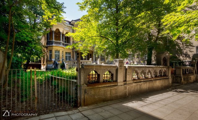 Das Grundstück verfügt über einen weitläufigen Vorgarten, der durch ein filigranes, schmiedeeisernes Gitter vom Gehweg getrennt ist. Eine imposante dreistufige Treppe führt zum Haupteingang. Besonders bemerkenswert sind die beiden seitlichen Portale, die eigens für Kutschen und Pferdegespanne konzipiert wurden.