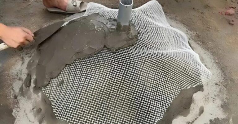 Nun wird eine dickere Mischung aus Zement und Sand (im Verhältnis 1:2) angerührt. Diese Masse wird gleichmäßig über das Drahtgeflecht verteilt. Glätte die Oberfläche und lasse sie mindestens 24 Stunden trocknen.