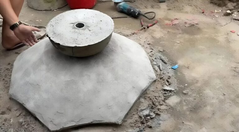 Während das Hauptelement aushärtet, bereite das Fundament vor: Stelle das PVC-Rohr in eine mit Öl oder Fett bestrichene Plastikschüssel und fülle sie mit derselben Zement-Sand-Mischung. Um die Konstruktion zusätzlich zu stabilisieren, können zerbrochene Ziegel oder Metallteile eingearbeitet werden.
