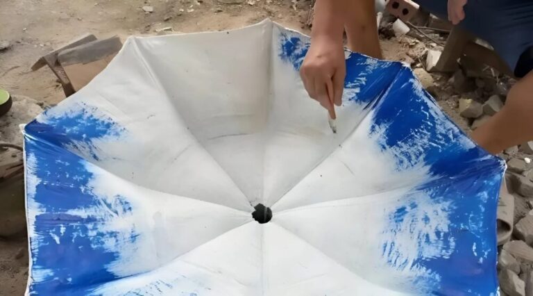 Sobald die erste Schicht getrocknet ist, bohre ein Loch in die Mitte des umgedrehten Schirms und setze ein PVC-Rohr ein, um die Konstruktion zusätzlich zu verstärken.