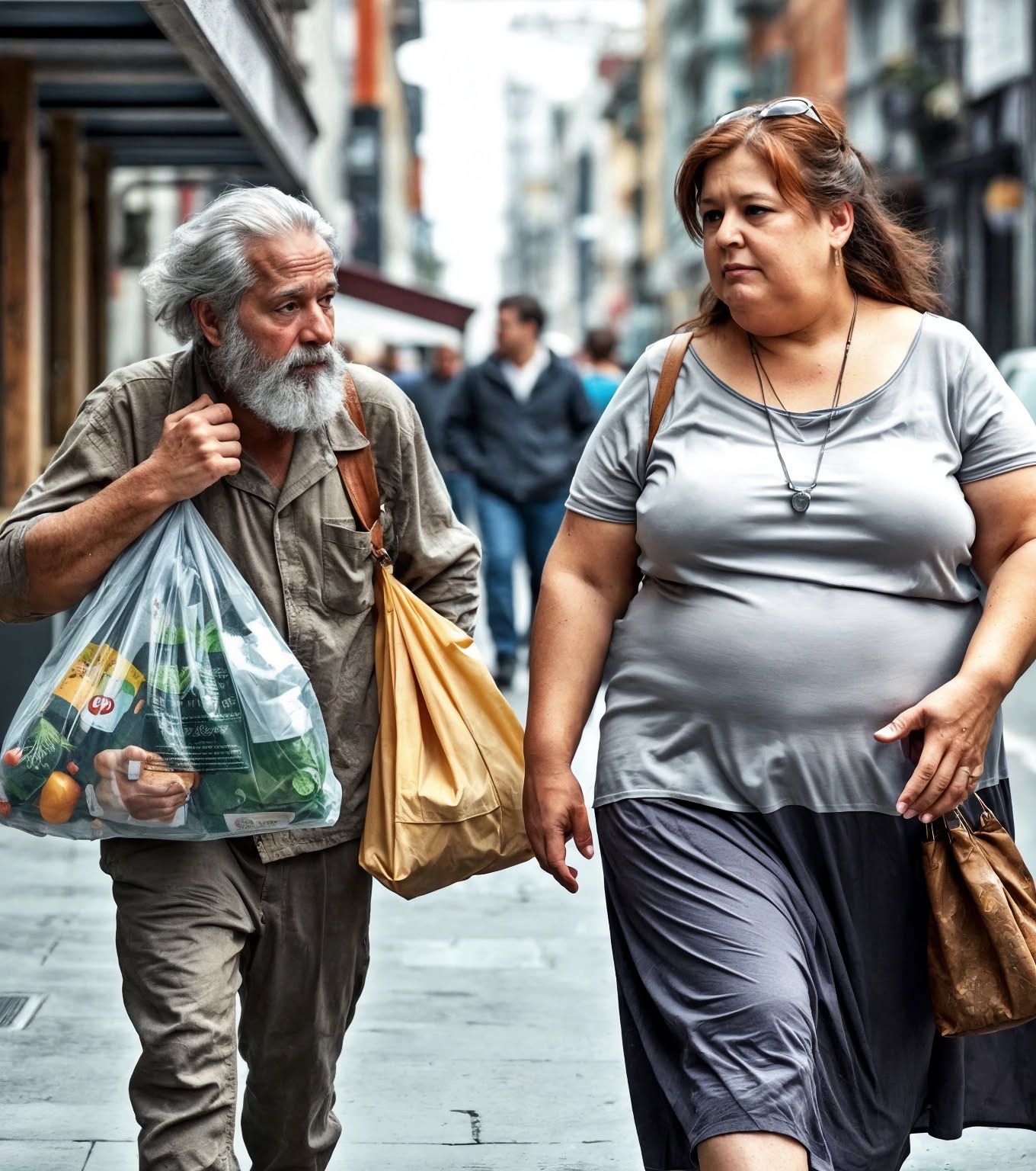 Der Mann nahm die Taschen mit Leichtigkeit entgegen, als wären sie leer, und schritt mit weiten, selbstbewussten Schritten auf ihn zu. Die Frau, hübsch und leicht beleibt, versuchte, mit ihm Schritt zu halten, und lief leichtfüßig, um nicht zurückgelassen zu werden. Zusammen bildeten sie ein fast komisches Duo: er, groß und kräftig, mit dem Schwung einer Militärparade, und sie, klein, süß, rundlich wie ein kleiner frischer Kuchen, deren Locken bei jedem Schritt wippten. Sie musste für jeden Schritt, den er machte, zwei machen.