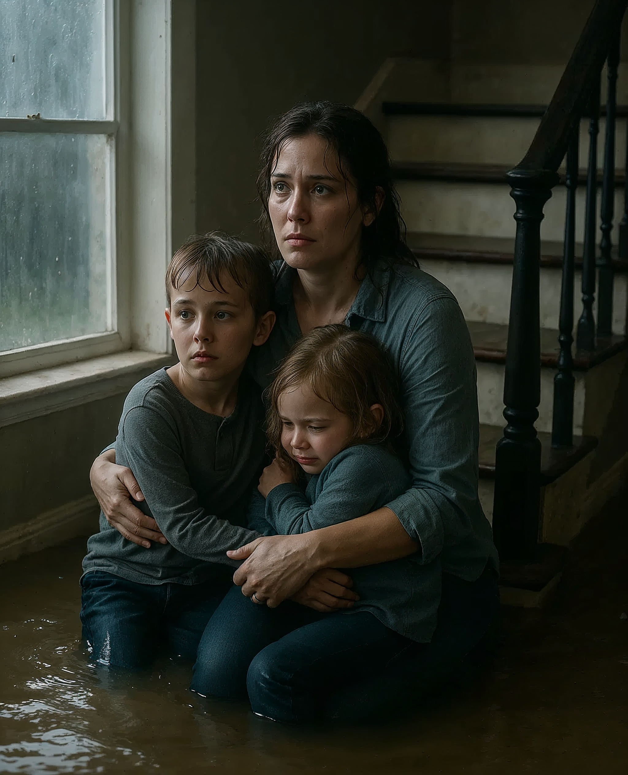 Wir schafften es ins obere Stockwerk, gerade rechtzeitig, bevor die Fenster im Erdgeschoss vom Wasser bedeckt wurden. Auf der Treppe klammerte ich mich an meine Kinder, flüsterte beruhigende Worte – mehr für mich selbst als für sie.