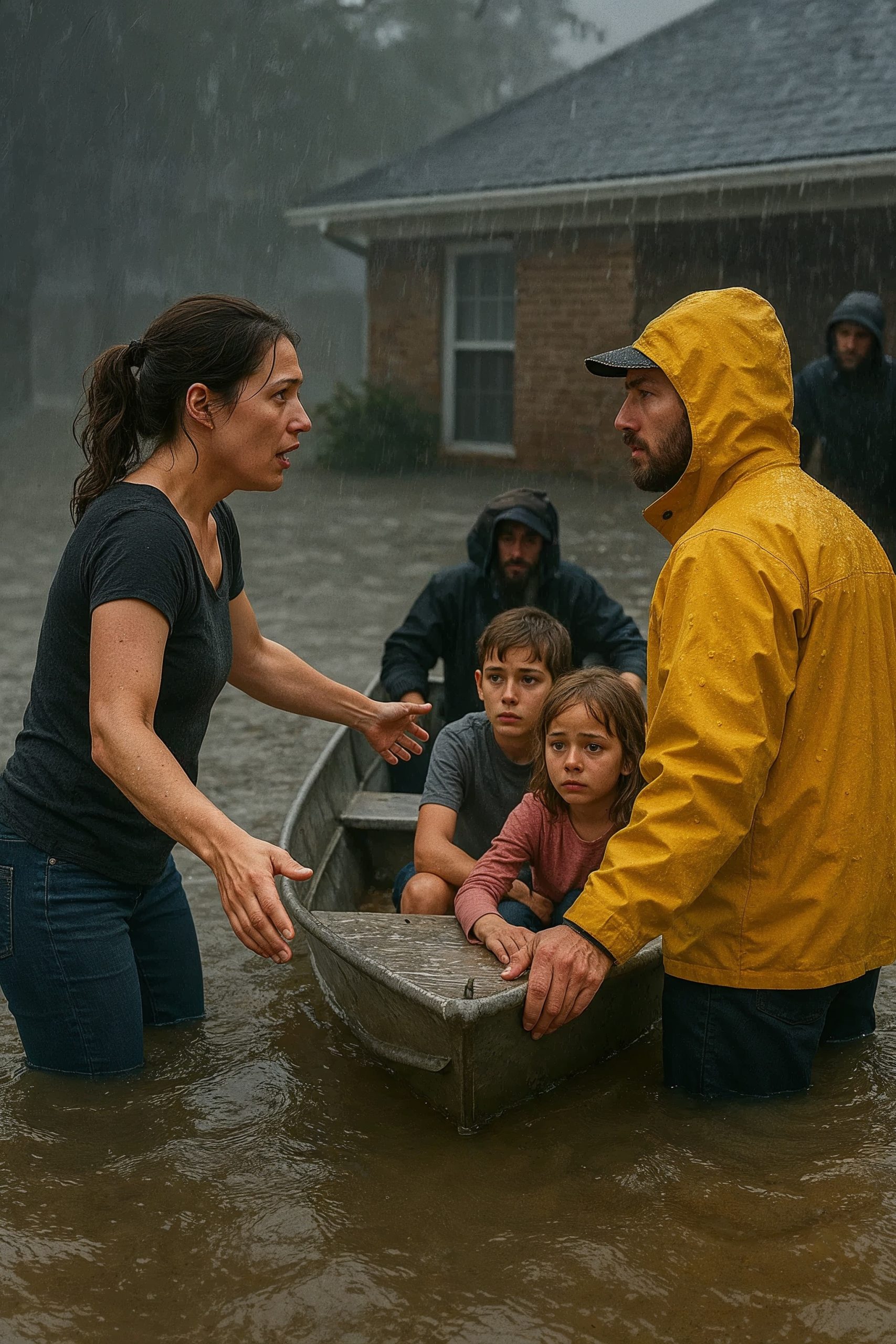 Als ich endlich selbst aus dem Haus kam, war das Wasser schon bis zur Taille gestiegen. Ich kämpfte mich nach draußen – gerade rechtzeitig, um ein kleines Rettungsboot zu sehen, in dem meine Kinder bereits in Decken gehüllt saßen.